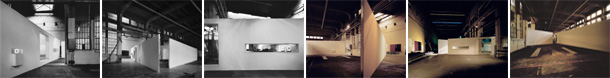... the main piece of this project, were three elements, each 17 meters long and 3 meters high. These were placed between the I and II nave of the factory Krauseco. The materials consisted of steel, aluminium and plasterboards which weighed more than four and a half tons. It was possible through incorporating steel inside of the three plains, they therefore stood by there own strength, for any aid which could be seen from the outside was not acceptable to me. One plain had areas cut out, wood was introduced to the side walls. Then to the inside and outside of the construction, two plains of transparent plexiglas were mounted. This permitted when standing in or outside of the construction, one could see through the transparent areas. The image within these areas turned out to be very abstracted forms.